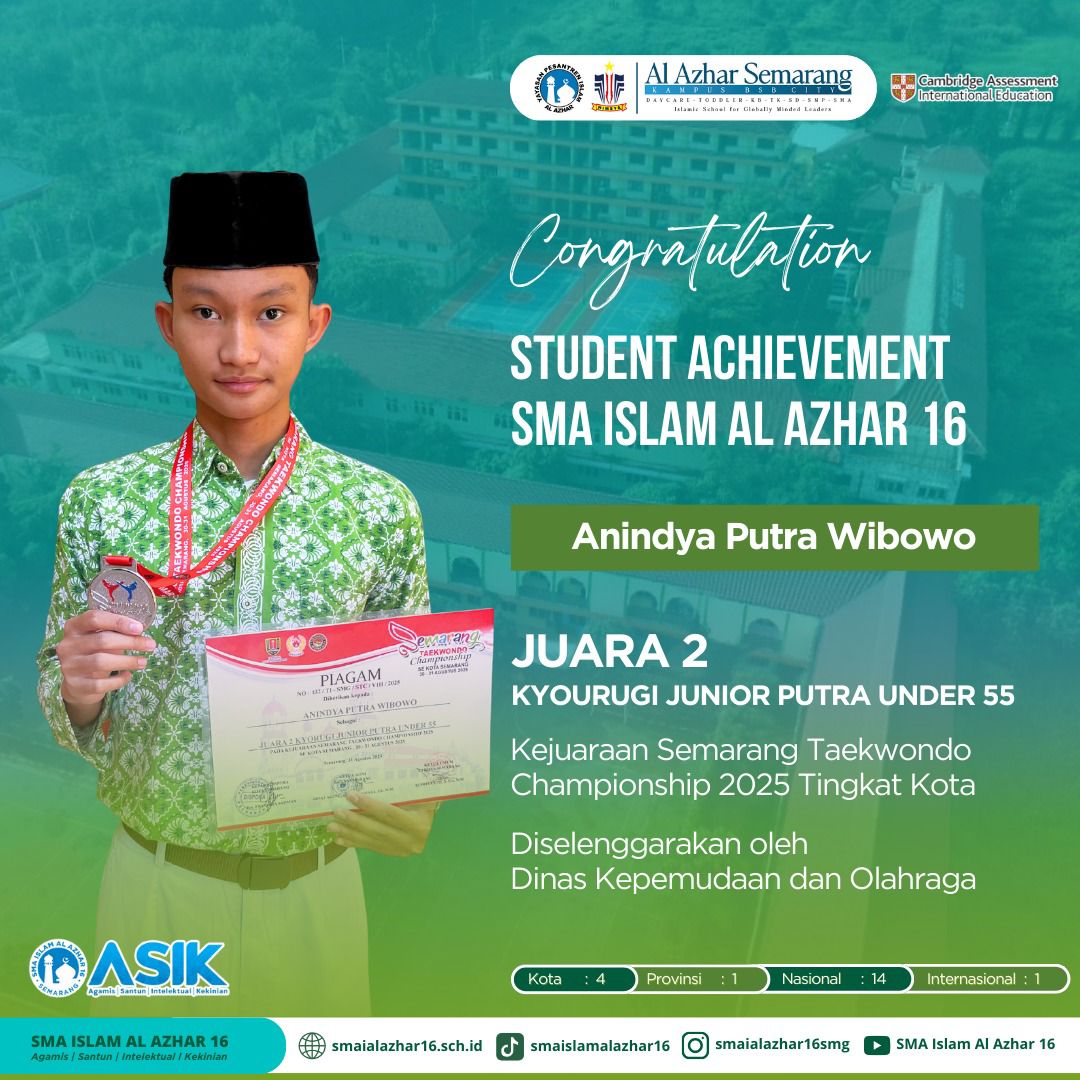 Assalamualaikum, Hallo Generasi ASIK Update program 1 Murid 4 Prestasi Dalam 1 Tahun Alhamdulillah, selamat dan sukses kami sampaikan kepada ananda Anindya Putra Wibowo Kelas XII Al Jabbar Yang berhasil meraih Juara 2 Kyourugi Junior Putra Under 55 pada Kejuaraan Semarang Taekwondo Championship 2025 Tingkat Kota. Prestasi ini menjadi bukti nyata kerja keras, doa dan dukungan dari semua pihak. Semoga pencapaian ini menginspirasi teman-teman lainnya untuk terus berjuang, berkarya dan mengharumkan nama sekolah serta bangsa. #SMATerbaik #GenerasiASIK #SMAIslamTerbaikSemarang #TahfidzandBilingualSchool #OneStudentFourAchievement