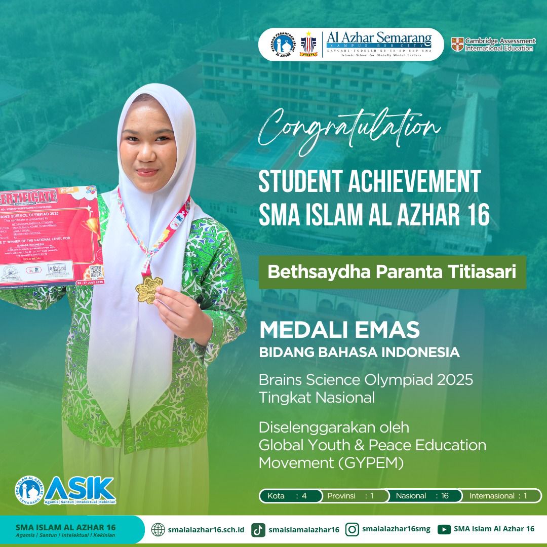 Assalamualaikum, Hallo Generasi ASIK Update program 1 Murid 4 Prestasi Dalam 1 Tahun Alhamdulillah, selamat dan sukses kami sampaikan kepada ananda Bethsaydha Paranta Titiasari Kelas XI Al Farabi Yang berhasil meraih Medali Emas Bidang Bahasa Indonesia pada Kejuaraan Brains Science Olympiad 2025 Tingkat Nasional. Prestasi ini menjadi bukti nyata kerja keras, doa dan dukungan dari semua pihak. Semoga pencapaian ini menginspirasi teman-teman lainnya untuk terus berjuang, berkarya dan mengharumkan nama sekolah serta bangsa. #SMATerbaik #GenerasiASIK #SMAIslamTerbaikSemarang #TahfidzandBilingualSchool #OneStudentFourAchievement