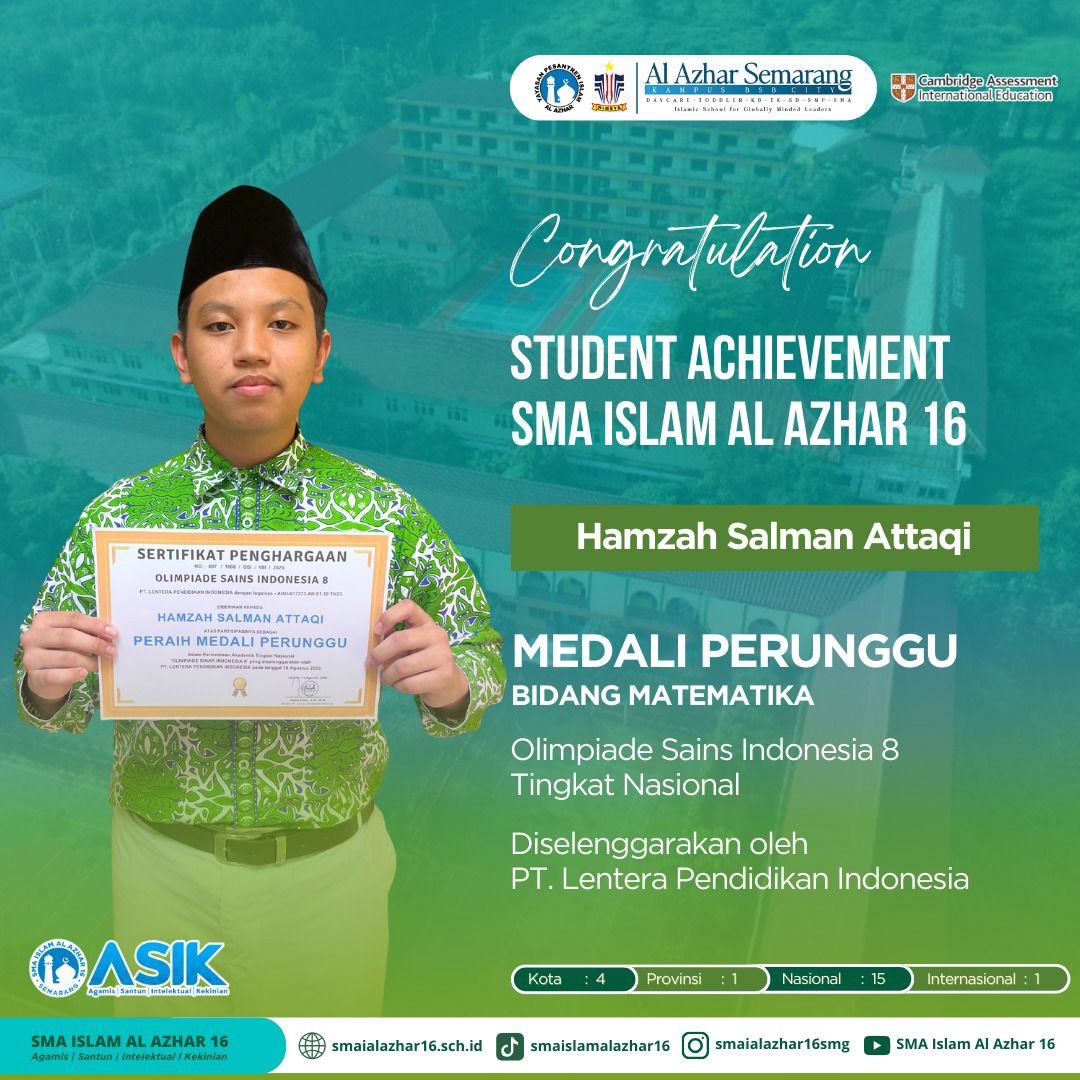 Assalamualaikum, Hallo Generasi ASIK Update program 1 Murid 4 Prestasi Dalam 1 Tahun Alhamdulillah, selamat dan sukses kami sampaikan kepada ananda Hamzah Salman Attaqi Kelas X Ibnu Haytham Yang berhasil meraih Medali Perunggu Bidang Matematika pada Olimpiade Sains Indonesia 8 Tingkat Nasional. Prestasi ini menjadi bukti nyata kerja keras, doa dan dukungan dari semua pihak. Semoga pencapaian ini menginspirasi teman-teman lainnya untuk terus berjuang, berkarya dan mengharumkan nama sekolah serta bangsa. #SMATerbaik #GenerasiASIK #SMAIslamTerbaikSemarang #TahfidzandBilingualSchool #OneStudentFourAchievement